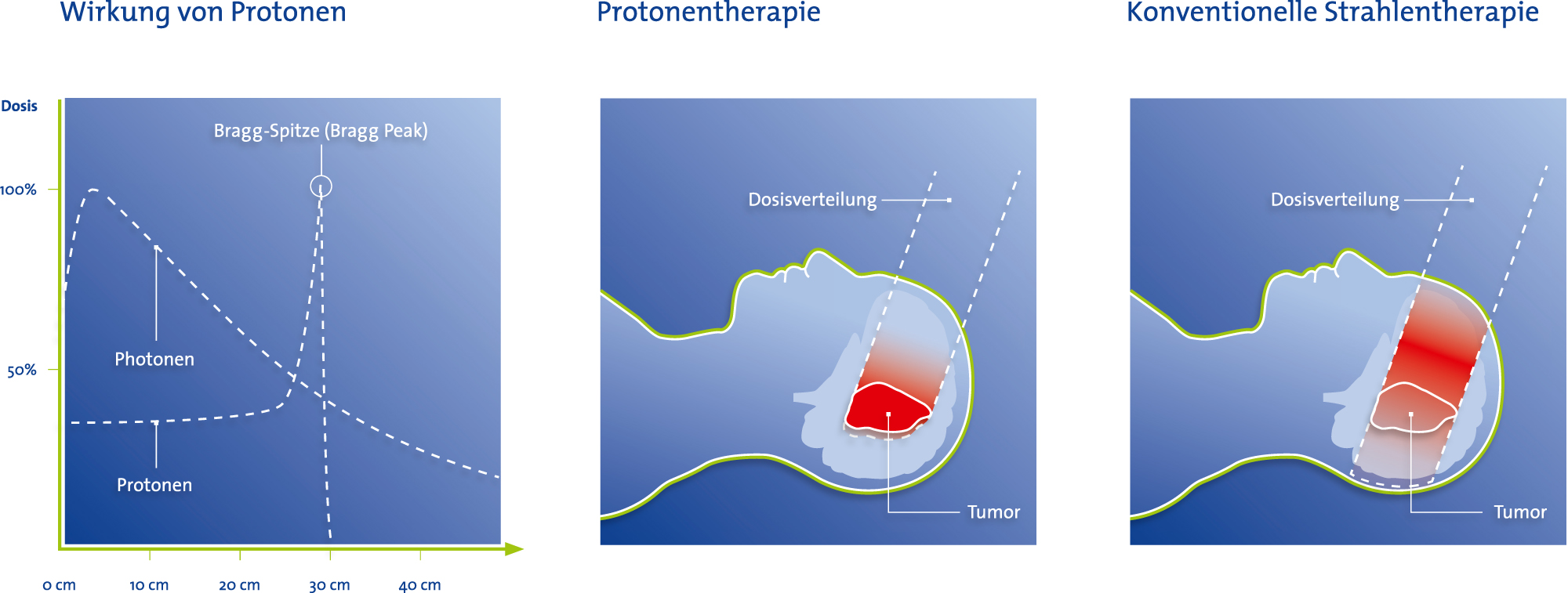 Vergleich der Freisetzung von Strahlenenergie bei Photonen und Protonen in unterschiedlicher Eindringtiefe in den Körper: